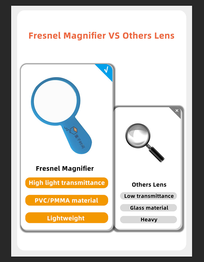 Compared with traditional thick glass lenses, Fresnel lenses offer significant advantages for reading and magnification applications: